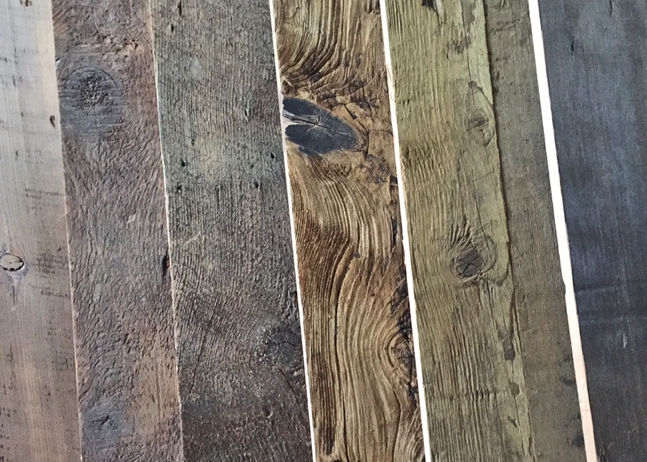 Reclaimed wood ages brown – at least when it’s not daily exposed to light. Outside of time, other factors result in a wide range of brown – wood species, age of boards, original saw blade orientation, use and it’s exposure to a mix of man made influences – from tobacco smoke, pickle juice and other food grade fluids. All of the browns in their ‘found’ condition evoke a warm natural quality, but with individual personality. The woods below are a collection of antique grade Spruce/Fir, Hemlock, White Pine and potentially other species – sourced from barns, residential buildings, mushroom drying boards and Worcestershire Sauce tanks. The design possibilities within the family of natural browns are limitless.